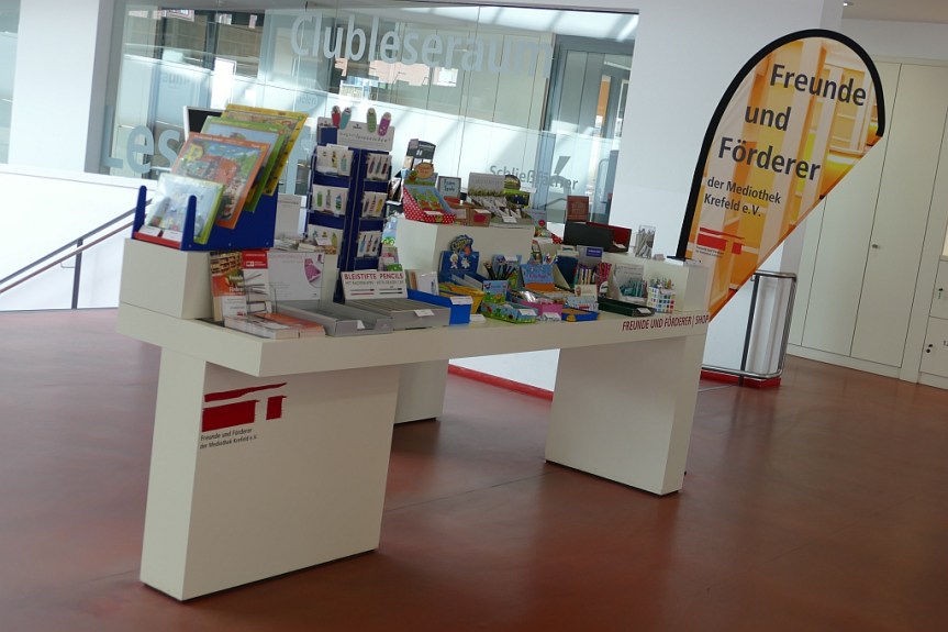 Das Engagement für den Shop, den die „Freunde und Förderer der Mediothek e.V.“ im Neubau installiert haben, trägt kontinuierlich (Einnahme-)Früchte und erforderte in der Zwischenzeit Umbau und Erweiterung des ursprünglichen Möbels.