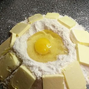 Mehl, Zucker, Vanillezucker, Mandeln und 1 Prise Salz auf die Arbeitsfläche häufeln. Die Butter kleingeschnitten darauf verteilen.