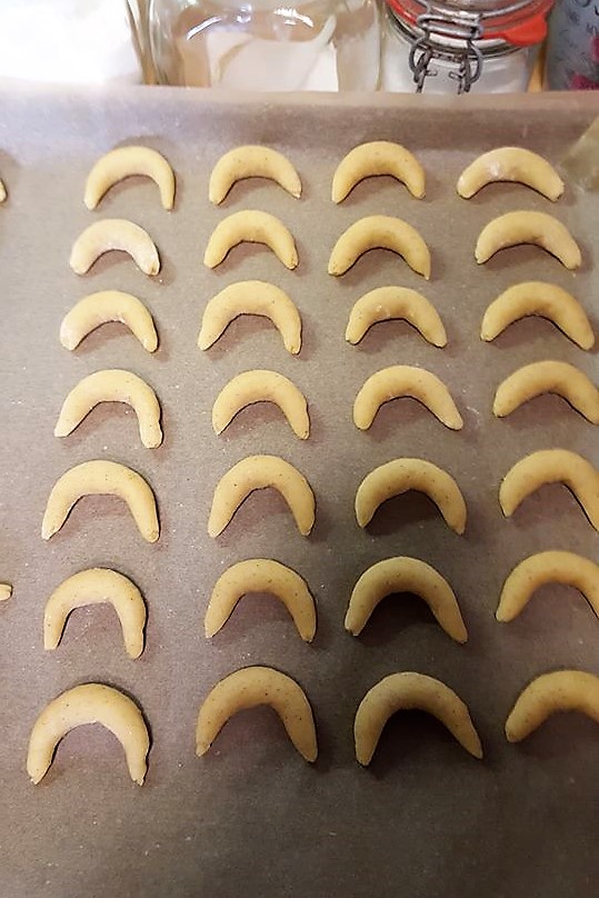 Den Teig portionieren und zu schmalen Rollen formen. Diese in ca. 7cm lange Stücke teilen. Die Teigstücke zu Hörnchen biegen, damit die sogenannten „Kipferl“ draus werden. Mein Tipp, macht die Enden nicht zu dünn, da sie sonst beim Backen zu hart und trocken werden.