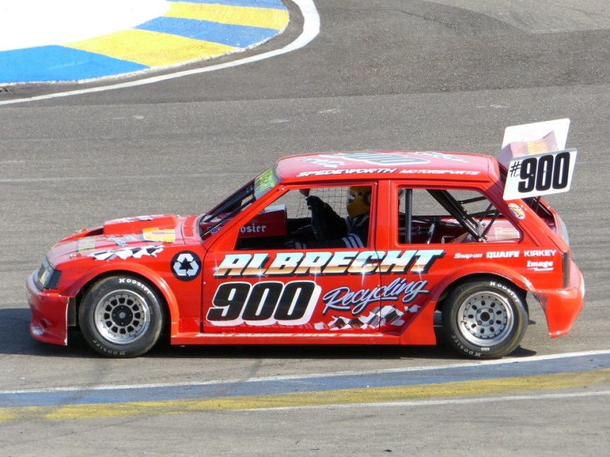Tja…und dann sah ich ein Teil fliegen und hörte das fiese Geräusch, wenn ein Auto in die Mauer einschlägt. Bange Sekunden verstrichen, dank der Tribünen für das innere Oval war der rote Camaro nicht zu sehen. Dann rollte Patrick aus, von weitem sah man schon, der Einschlag war heftig. Die ganze Aufhängung und das Rad auf der rechten Seite waren verschwunden, die Karosserie derb verbogen. Es herrschte auf unserem Hügel dann kollektives Aufatmen, als Patrick selbstständig aus dem Auto klettern konnte.