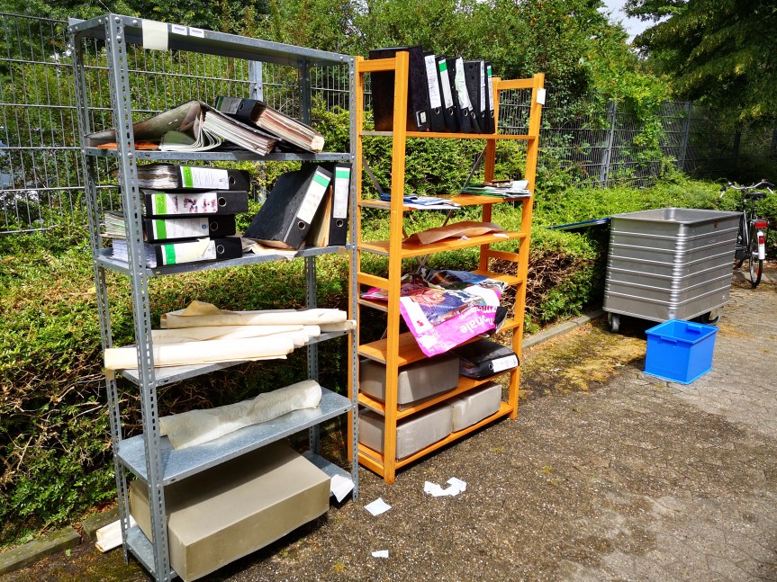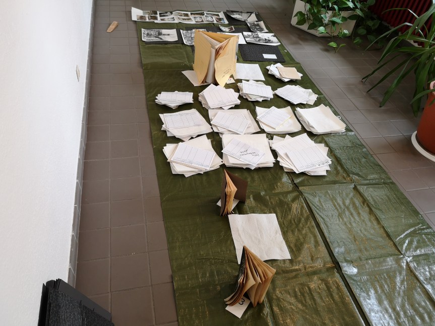 Die Kolleg*innen vom Stadtarchiv und die beiden Restaurator*innen hatten ein wunderbares Schadensszenario vor dem Gebäude des Archivs aufgebaut, damit wir an echten Akten, Fotos usw. üben konnten.