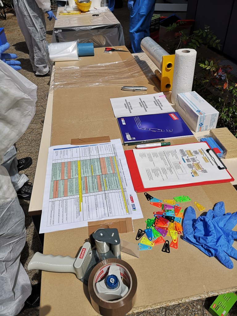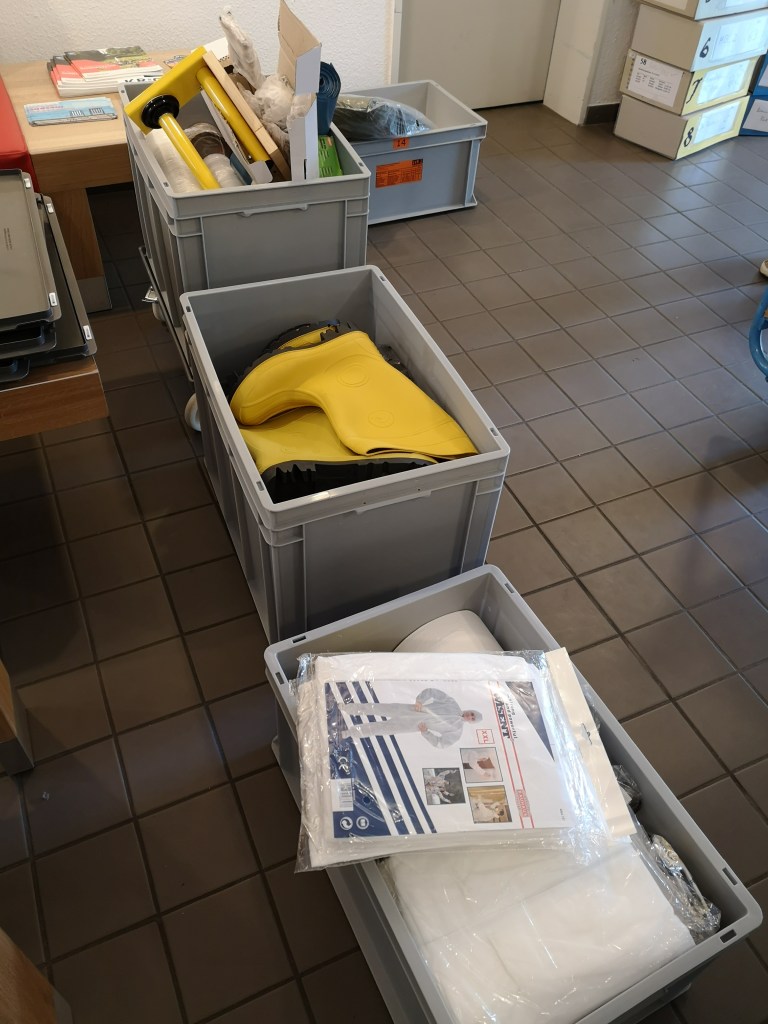 Ihr denkt jetzt vielleicht, na, das ist ja ein lauer Job, aber das war noch nicht einmal die Notfallübung. Das Ausräumen der Regale ist anstrengende körperliche Arbeit und das stundenlange Stehen an den Tischen, an denen die Entscheidungen getroffen werden und die Archivalien bearbeitet werden, schlaucht auch ganz schön. Wir standen in unseren Schutzanzügen auch die gesamte Zeit in der Sonne, weil wir auf den Aufbau der Schutzzelte verzichtet hatten. Also im Ernstfall: Zelte aufbauen ;-).