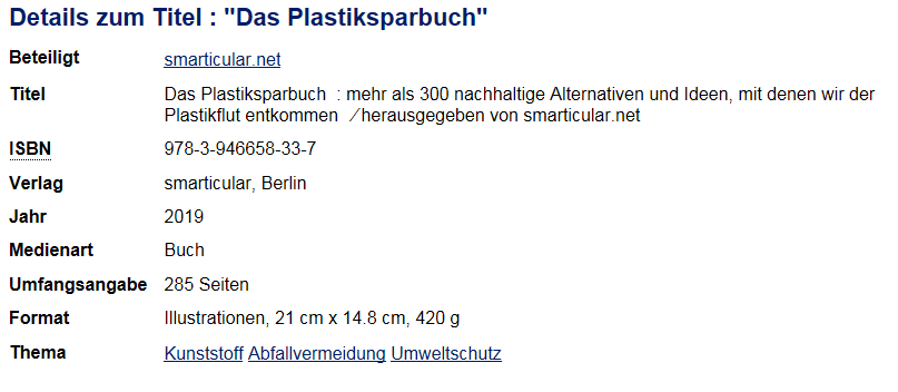 Dieses Paperback des Internet-Ideenportals smarticular liefert informative und gut verständliche Hintergrundinformationen zu Fragen wie: was ist Plastik? Wo liegt das Problem? Wann ist Plastik sinnvoll?