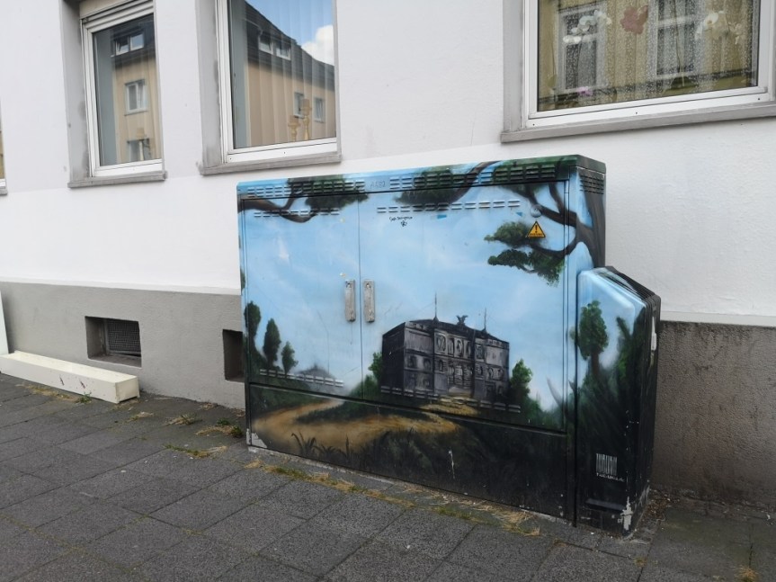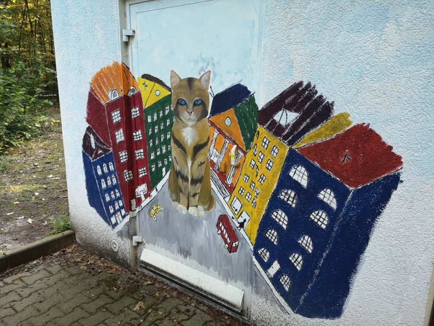 Mitten im Forstwald findet sich dann auch wieder Kunst, im Rahmen eines Projektes wurde hier von Jugendlichen dieses Trafohäuschen, oder was immer es ist, bemalt. Wollen wir hoffen, dass wir uns noch lange daran erfreuen können. Ist wirklich schön geworden und macht Krefeld wieder ein Stück bunter.