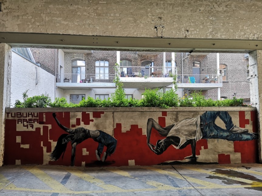 Die Lewerentzstraße hinauf führt die Tour dann weiter in Richtung Westen, vorbei an der Shedhalle. Das hat aber nichts mit „chatten“ zu tun, sondern ist eine Dachbauform, die Krefelder Shedhalle war Teil der Samtweberei an der Lewerentzstraße und ist heute ein geniales Nachtbarschaftsprojekt. Dort mal anzuhalten und sich das Ganze anzuschauen lohnt auf jeden Fall, nicht nur, weil auch hier wieder ein Tubuku Werk an der Wand prangt 😉