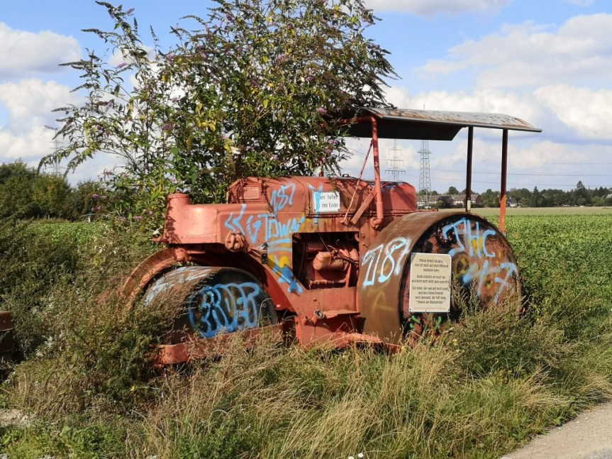 Parallel zur Bahnstrecke von Krefeld nach Viersen geht es weiter auf einem schön zu radelnden Weg, bis man auf der rechten Seite auf eine ausrangierte Dampfwalze trifft. Sie dient als Spielgerät und bitte um die ein oder andere Spende für das Hospiz am Blumenplatz. Sie ist immer ein guter Grund einen kurze Pause einzulegen, Züge zu gucken und was zu trinken.