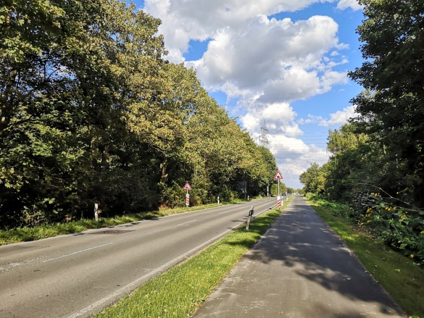 Ein bisschen weiter nach Süden geht es dann noch, grob in Richtung Willich und dann kommt der Schwenk auf die Anrather Straße. Ab diesem Moment radeln wir auf einem Aufreger der letzten Monate. Seit einiger Zeit gibt es dort einen Radweg, eigentlich also eine super Sache, zumal wenn man die Situation vorher kennt. Dort fuhr man als Radler nämlich auf einer Straße, ohne Randbefestigung, und wurde ständig von schweren LKW überholt, die aus dem Gewerbegebiet kamen. Seit Kurzem gibt es also einen Radweg dort, leider endet er an einem Bahnübergang und wird erst danach fortgesetzt. Riesen Aufschrei, wie kann man nur so blöd sein, typisch Stadt, nicht zu Ende geplant. Nun, Fakt ist, für den Bahnübergang ist die Stadt gar nicht zuständig, wir Radler haben jetzt 300 Meter mehr sicheren Radweg als vorher und, da es nen EU Topf war, hat diese zusätzliche Sicherheit die Stadtkasse nicht einen Cent gekostet. Also, die gefährliche Stelle am Bahnübergang ist noch da, der Rest aber ein echter Gewinn.