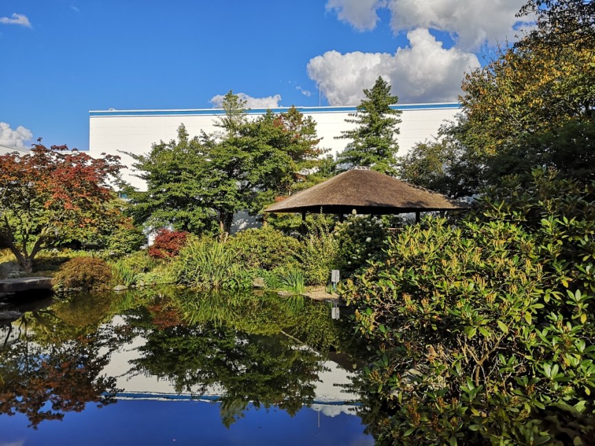 Der japanische Garten verfügt über ein Teehaus, einen Wasserfall, Teiche und viele Pflanzen. Quasi im Hinterhof des Werkzeugmaschinen-Herstellers Okuma gelegen ist er, zumal am Wochenende, für jeden zugänglich und lädt tatsächlich zum verweilen ein.