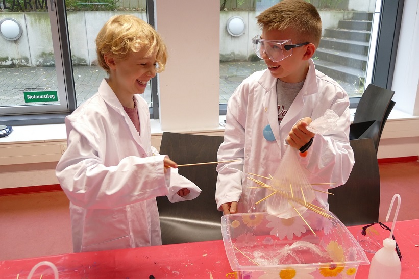 Zum Glück hatten wir die großen Schüsseln, über denen wir den Versuch durchführen konnten, denn bei keinem funktionierte es auf Anhieb. Als einige der Teilnehmenden schon aufgeben wollten, verriet Hr. Popovic uns einen Trick: die Spieße nacheinander mit Tempo durch den Beutel stechen. Mit diesem Trick gelang es einem der angehenden Naturwissenschaftler, gleich 31 Spieße durch seinen Beutel zu stechen.