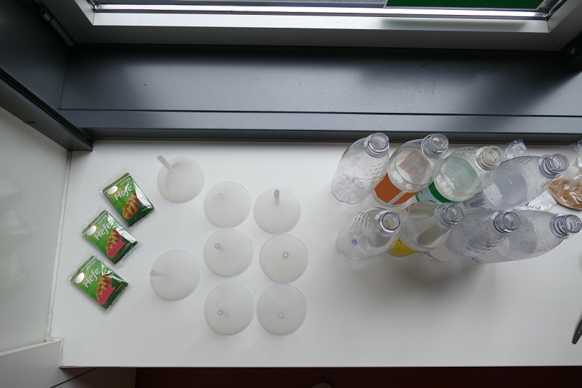 Zur Vorbereitung trafen wir uns um 10:00 Uhr – also eine Stunde vor Öffnung der Mediothek bzw. Beginn des MINT-Clubs – in den Studios und bauten alle Materialien auf, die wir für die anstehenden Experimente benötigen würden. Hierzu grasten wir die mit Schutzbrillen, Pipetten, Laborkitteln, Spritzflaschen, Bechergläsern und diversem anderen beladenen Materialwagen ab, die die Mediothek mittlerweile ihr Eigen nennt. Dann setzten wir uns noch für einen Kaffee zusammen und erzählten ein bisschen.