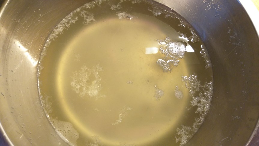 Lasst den entstandenen Sirup abkühlen und gießt ihn dann zusammen mit dem Zitronensaft und dem restlichen Wasser (nach Geschmack mit oder ohne Sprudel) in einen Krug oder eine Flasche, die etwa 1,5 Liter fasst. Ihr könnt es natürlich auch so machen wie ich, und zur Zwischenlagerung erstmal eine große Schüssel nehmen 😉