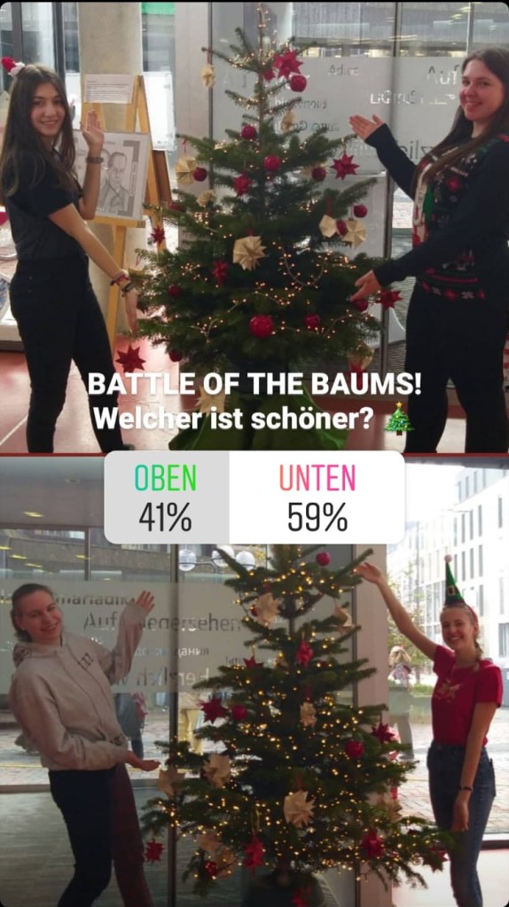 Nach einer langen Vorbereitung auf die bevorstehende Schlacht war es soweit. Die Bäume waren fertig und die Abstimmung begann. Beide Teams zitterten und konnten es kaum erwarten das Ergebnis zu sehen, aber am Ende konnte man doch sagen, dass der schönere Baum gesiegt hat (Aus welchem Team ich komme dürft ihr rätseln 😉 )