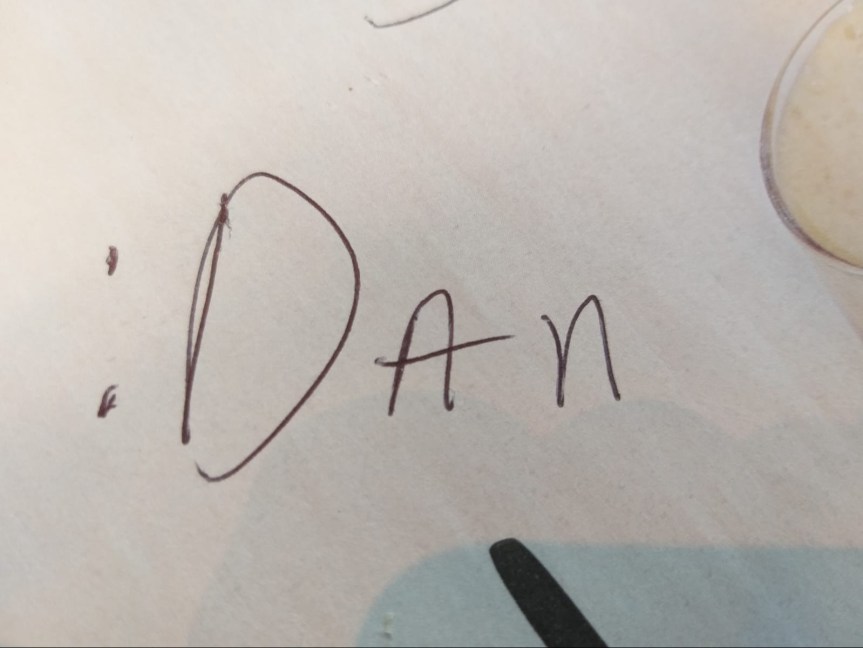 Unsere Bedienung hatte sich uns als Dan vorgestellt und diesen Namen auch sicherheitshalber nochmal auf unsere Papiersets geschrieben, damit wir ihn würden rufen können, wenn wir ihn brauchten. Er war wirklich sehr nett und gab uns sogar noch Sightseeing-Tipps, wofür wir uns revanchierten, indem wir ihm einen VIEL cooleren Weg zeigten, wie er seinen Namen schreiben konnte. Dazu war nur eine winzige Änderung möglich: ein Doppelpunkt davor, sodass das D so aussieht als würde es lachen 😉