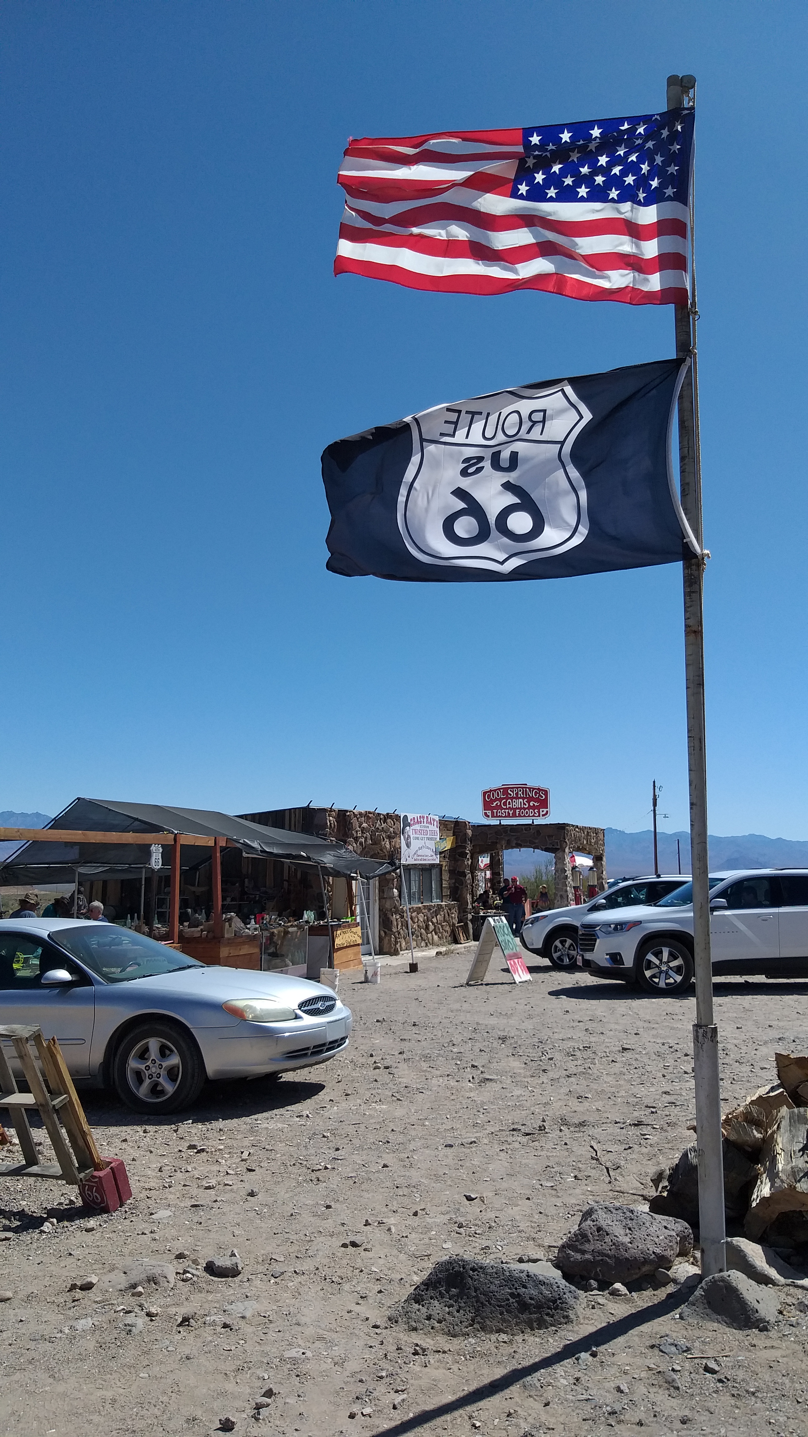 Tatsächlich war die Route 66 (oder zumindest dieser Teil davon) gar nicht so beeindruckend wie erwartet. Wäre da nicht die eine Raststätte am Straßenrand gewesen, bei der die Flagge gehisst war und wo zwei Autowracks vor sich hin rosteten, hätte es ein ganz normaler Highway sein können, wenn auch durch schöne Serpentinen geleitet.