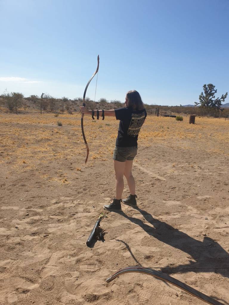 Wofür ich die Zeit dort unbedingt nutzen wollte, war Bogenschießen. Es gab drei Bögen plus Pfeile, die man sich leihen konnte, und einen Trainingsbereich mit Strohballen und Papp-Kojoten als Schussziele. Vor allem am Anfang traf man die natürlich nicht unbedingt. Aber nach einer Weile und mit ein bisschen Übung wurden wir alle drei- na ja, vielleicht keine Profis, aber auf jeden Fall besser 😀