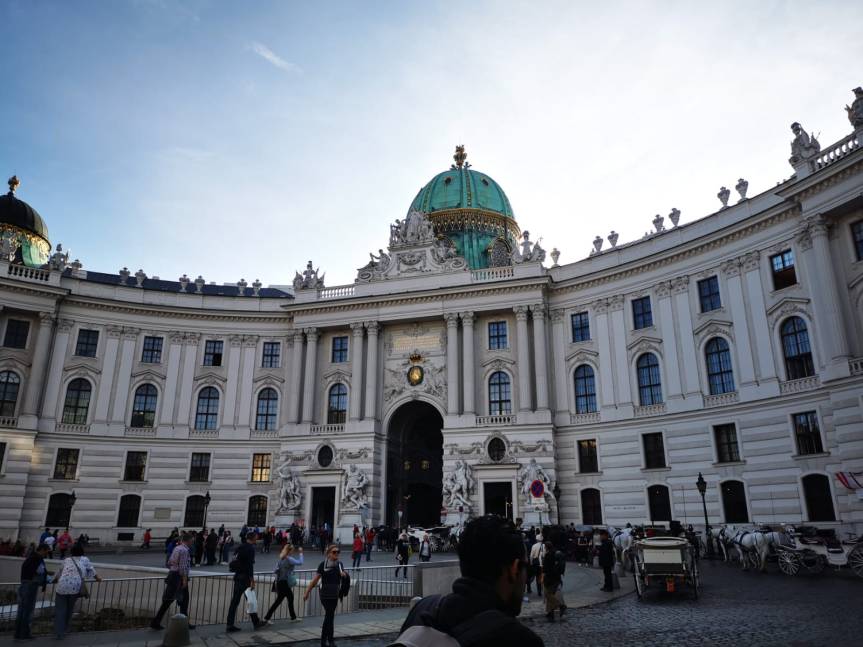 Dann hieß es erstmal Sightseeing. Als erstes ging es über die Kärntner Straße Richtung Stephansdom. Auf dem Weg dorthin stärkten wir uns mit feinsten Macarons und nutzten die ersten Touristenfallen, um uns mit schokoladigen Mozartsouvenirs einzudecken. Bald erreichten wir auch den Stephansdom, dessen Spitze allerdings von dichtem Nebel verdeckt wurde / umhüllt war. Laut Jule / Jule beteuerte, dass dieser sicher bald der Sonne weichen würde, war doch jeder einzelne letzte Tag von gutem Wetter und strahlendem Sonnenschein gesegnet. Doch dazu sollte es den gesamten Tag nicht mehr kommen. Natürlich führte unser Weg auch zur berühmten Hofburg, gesäumt von Fiakern. Bevor wir dadurch weiter zur Nationalbibliothek gingen, schauten wir noch in die Ställe der Spanischen Hofreitschule.