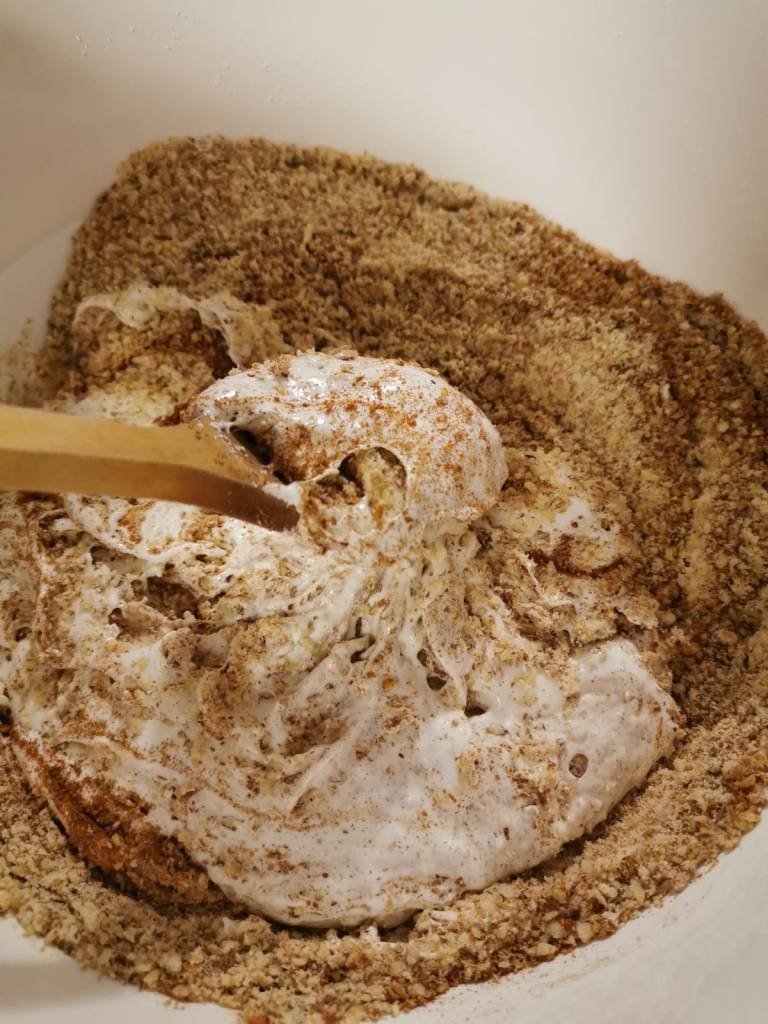 Hebt jetzt vorsichtig die Mandeln unter und verfeinert den Teig mit Zimt, Vanillezucker und Rum.