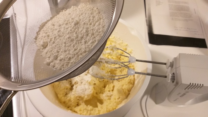 Nun schlagt ihr Butter, Zucker und Vanillezucker schaumig und fügt unter weiterem Rühren das gesiebte Mehl hinzu.