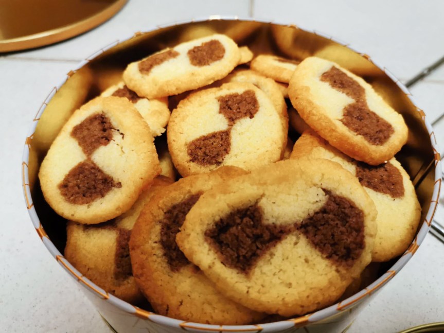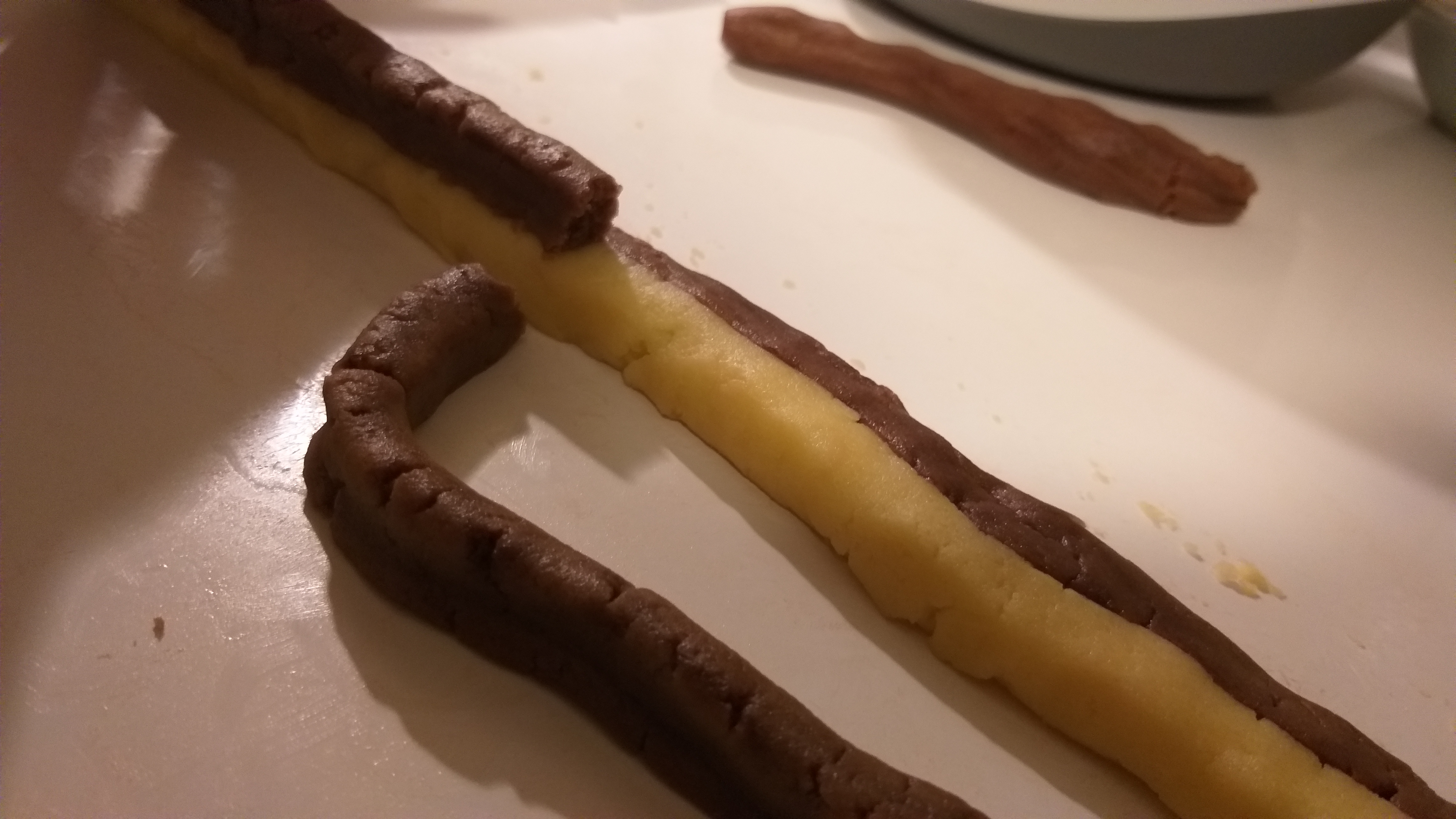 Formt aus dem Teig lange Stränge, die ihr in Frischhaltefolie (oder umweltfreundlicher in Bienenwachstücher) verpackt und kühl stellt. Für den besonderen Kick kann man auch noch ein paar gehackte Mandeln einarbeiten 😁 Eine besonders coole Variante ist natürlich das Schwarzweißgebäck. Ist aber auch etwas anstrengend 😀
