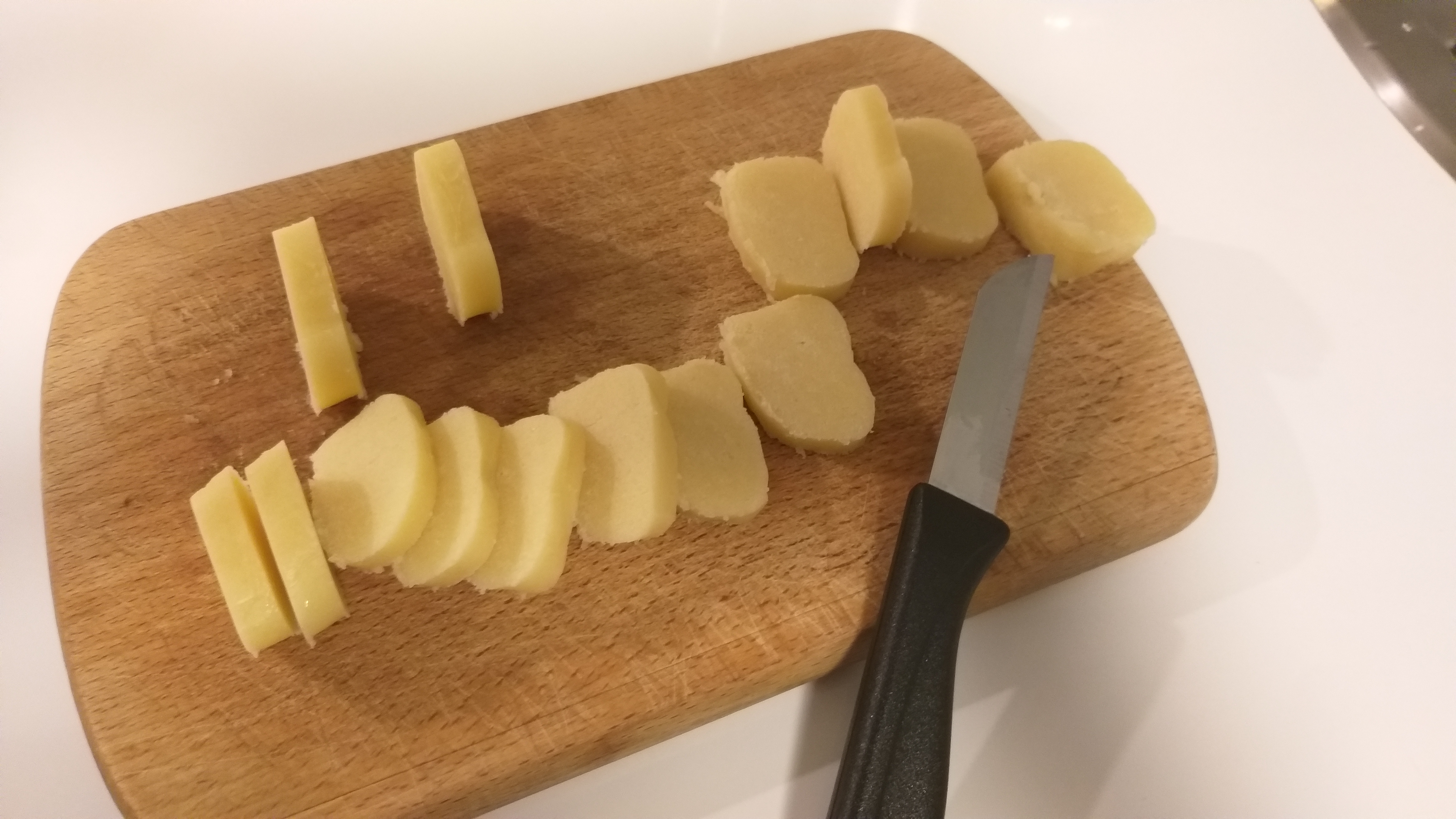 Mindestens zwei Stunden später sollte euer Teig durchgekühlt und fest genug sein. Schneidet die Stränge in etwa 0,5 cm breite Scheiben und legt sie mit etwas Abstand auf ein mit Backpapier ausgelegtes Backblech.