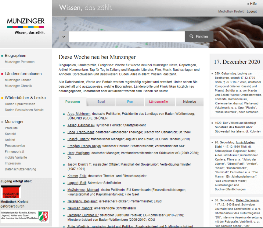 Anschließend gelangt man auf die Startseite von Munzinger, einem Portal mit Presse-, Kultur- und Wissensdatenbanken. Dort kann man entweder gleich nach einem bestimmten Eintrag suchen oder die Kategorien durchstöbern. Außerdem werden immer gleich die neusten oder neu überarbeiteten Artikel der Kategorien Personen, Sport, Pop, Länderprofile und Nekrolog (Todesfälle) angezeigt, sowie rechts in der Spalte besondere Ereignisse am jeweiligen Tagesdatum.