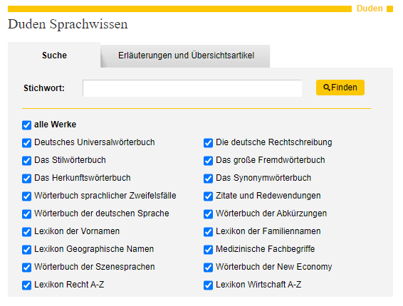 Über den gelben Menüpunkt Wörterbücher und Lexika auf der linken Seite kommt man auf die Seiten des Duden.