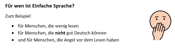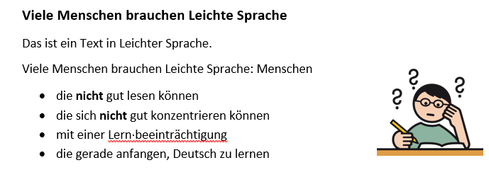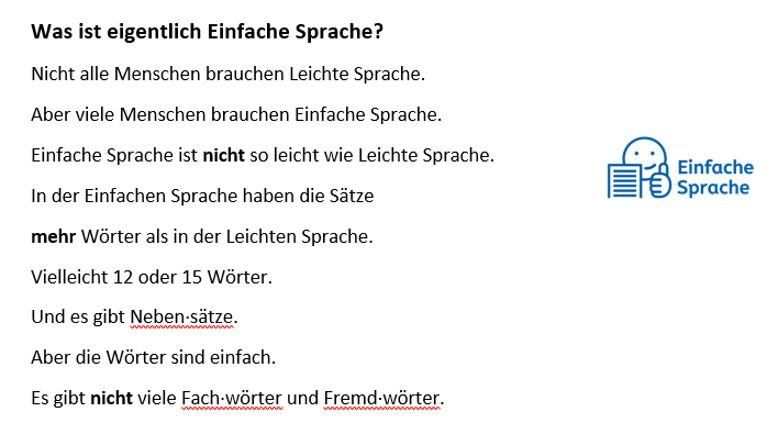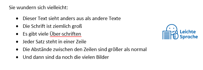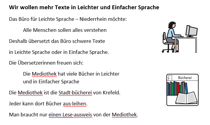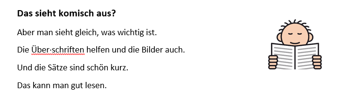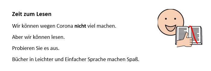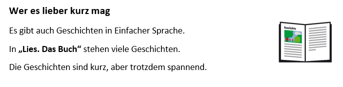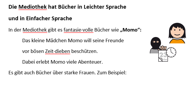 Lesen in Leichter und Einfacher Sprache – ein Beitrag der Lebenshilfe Krefeld e.V. Leichte Sprache erleichtert vielen Menschen das Lesen. Silvana PasquavaglioBüro für Leichte Sprache – NiederrheinLebenshilfe Krefeld e.V. METACOM Symbole © Annette Kitzinger Teilen auf:Tweet Klicken zum Ausdrucken (Wird in neuem Fenster geöffnet) Drucken Klicken, um einem Freund einen Link per E-Mail zu senden (Wird in neuem Fenster geöffnet) E-Mail Gefällt mir Wird geladen … Veröffentlicht von Mediothek Krefeld Stadtbibliothek war gestern - heute ist Mediothek! Zeige alle Beiträge von Mediothek Krefeld