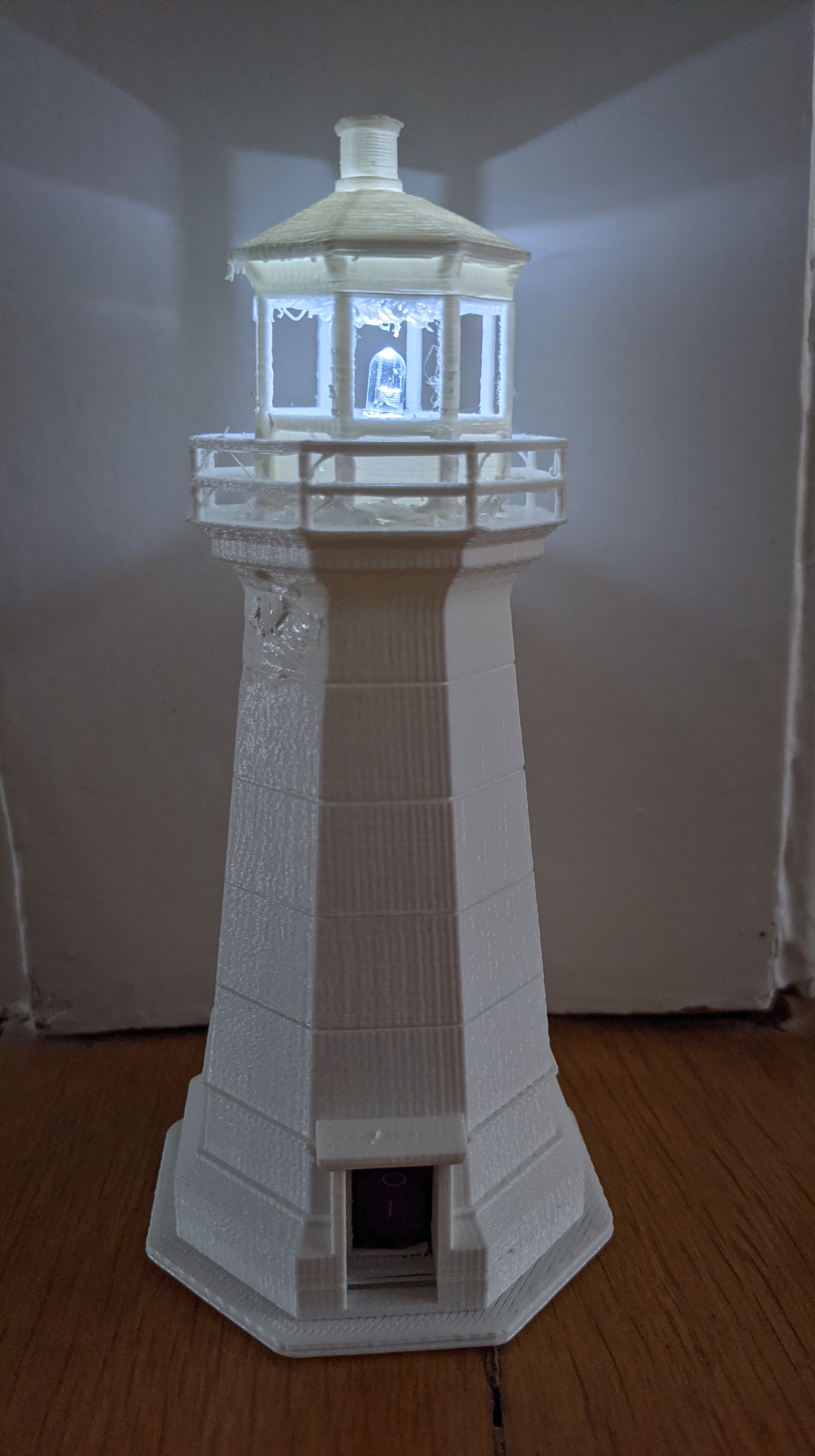 Ich hatte am Anfang keine Ahnung was ich bauen möchte, weshalb ich dann auf anderen Webseiten nach Ideen gesucht habe und mit ein bisschen Hilfe dann auf einen Leuchtturm gestoßen bin. Den habe ich dann in Tinkercad nachgebaut und auf meine vorhandenen Elektronik angepasst. Dabei musste ich vor allem darauf achten, im Leuchtturm so viel Hohlraum wie möglich zu schaffen, um erstens mehr Platz für die Elektronik zu haben und zweitens die Druckzeit zu verringern, da mein Projekt sowieso schon recht groß war und somit bis zu 5 Stunden Druckzeit hatte. Das war eine Sache, bei der Patrick Kathöfer sehr cool war, weil er immer wieder zwischen uns und der Mediothek vermittelt hat, um uns so gut wie alles zu ermöglichen!