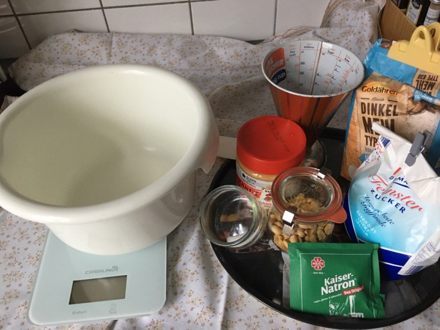 Gegenüber dem Originalrezept habe ich bei allen Zutaten je ein Viertel Menge dazugegeben –außer beim Zucker, den Anteil habe ich sogar reduziert-, weil die handelsübliche Abgabemenge der Erdnussbutter bei 350 g liegt.