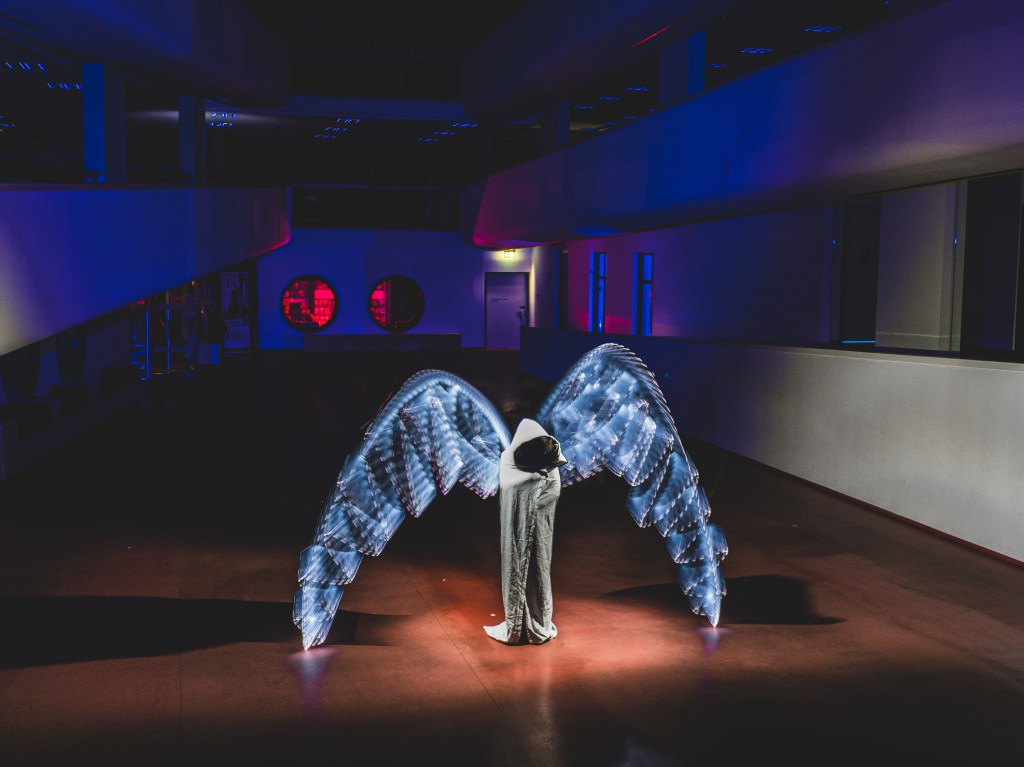 Die Person, die hier den Engel spielt, musste am Anfang extra belichtet werden, um sie auf dem Bild zu sehen (sie leuchtet ja nicht von sich aus). Danach wurden beide Flügel in die Luft gemalt.