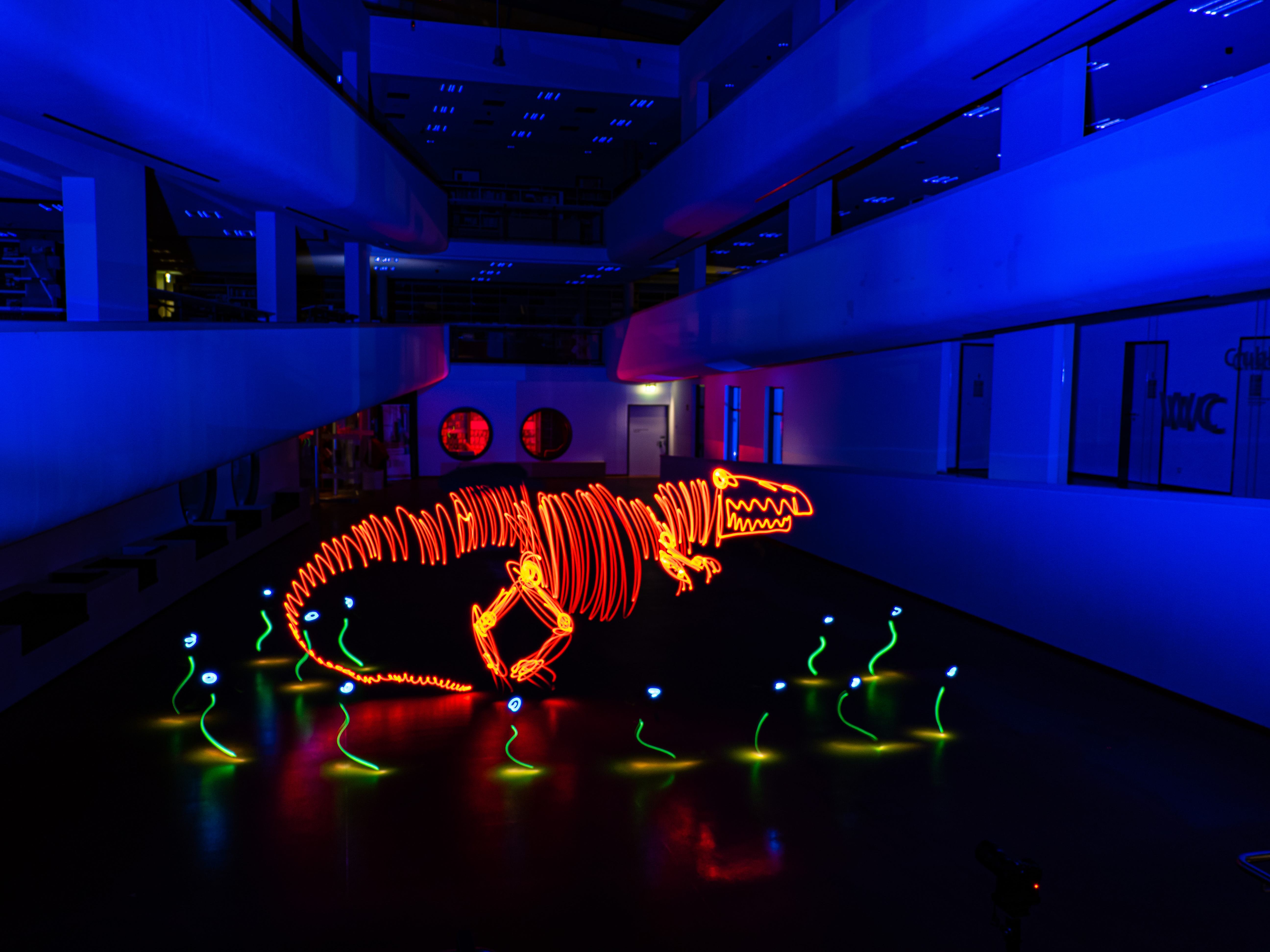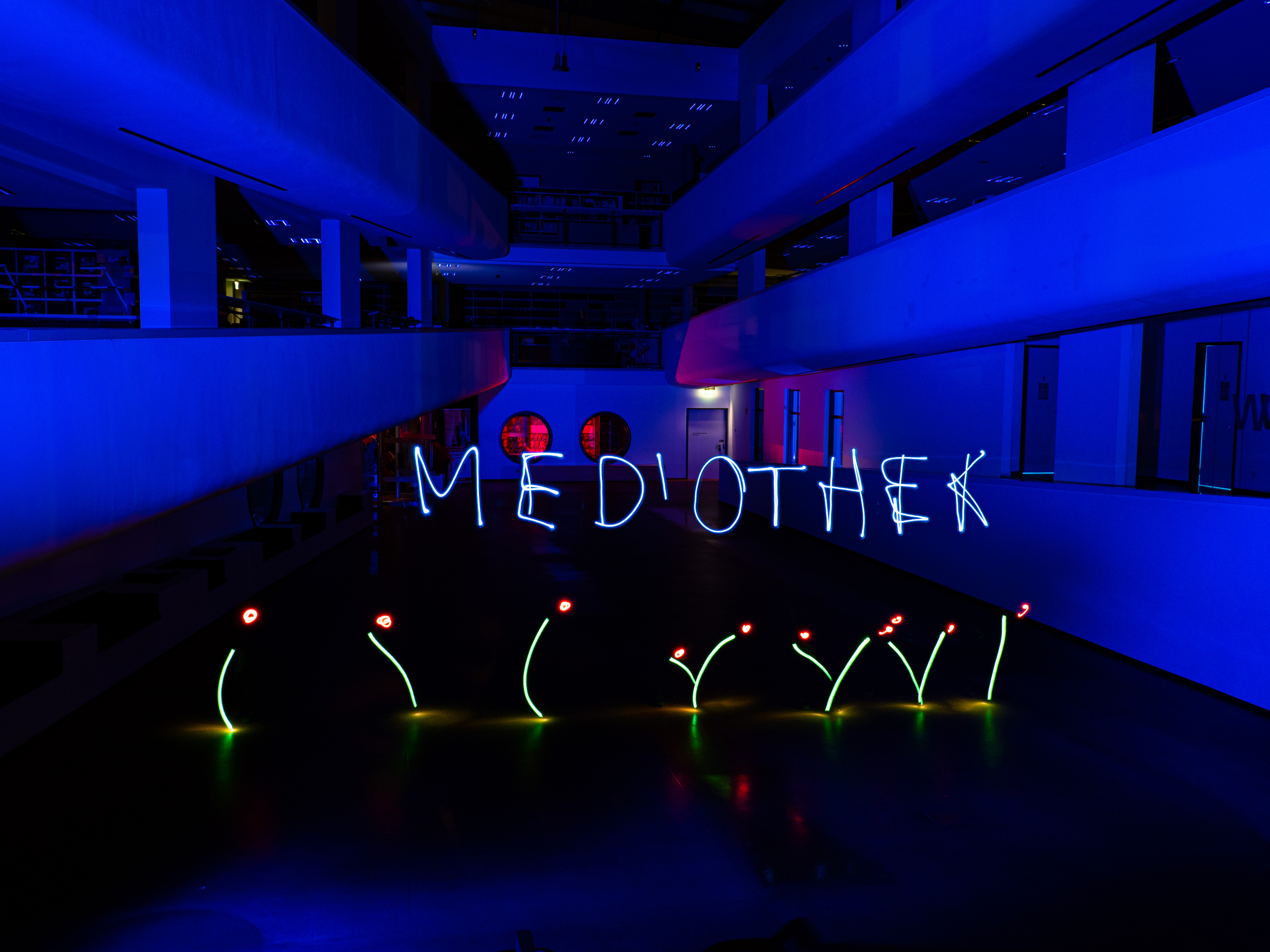 Für Rainer, der mit den verschiedensten Lichtern durch den ganzen Raum „gemalt“ hat, war es natürlich eine ziemliche Sporteinheit. Nach dem ersten Teil des Workshops konnten die Teilnehmer*innen aber auch selbst aktiv werden und das Lichter-Equipment von Rainer ein wenig unter die Lupe nehmen. Ein Mediotheksbild ist hier auch noch entstanden. Wer unseren Lightpainting-Kalender neulich bei uns erworben hat, kennt das sicher 😉
