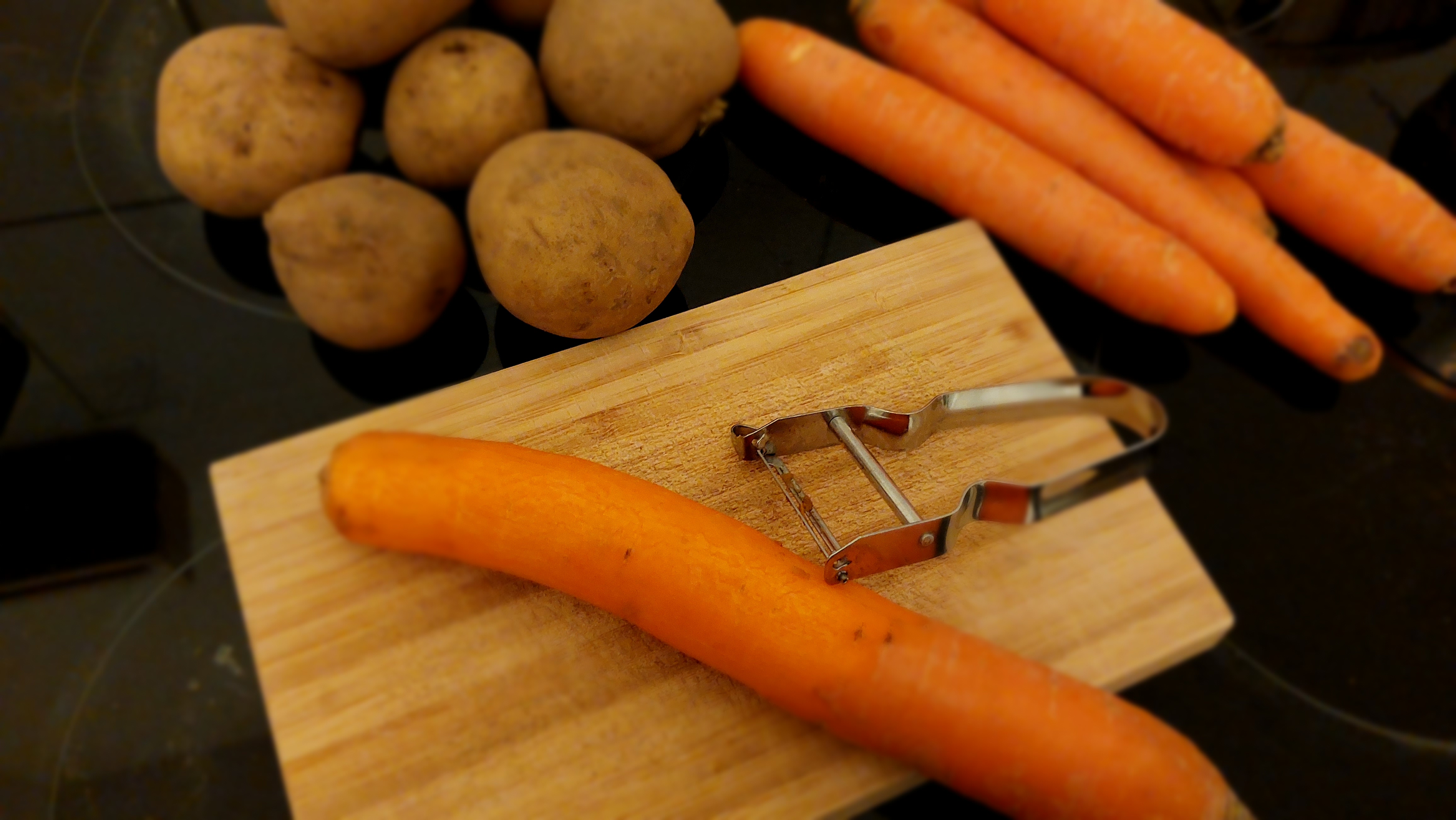 Erst einmal müssen die Möhren und Kartoffeln geschält und geschnitten werden. Ich würde empfehlen, die Möhren kleiner zu schneiden, da sie länger brauchen, um weich zu kochen, und man die Zeit so angleichen kann.