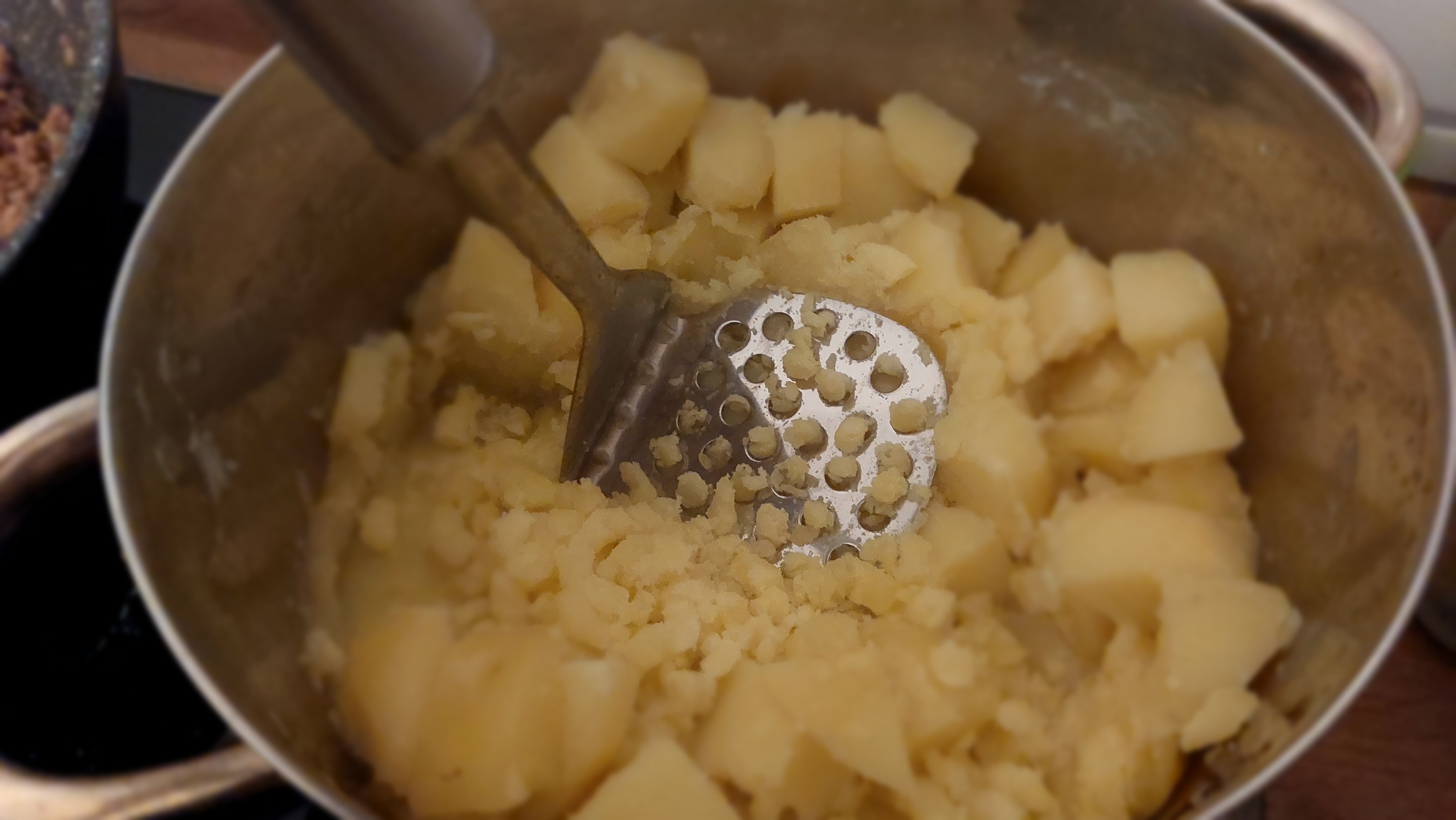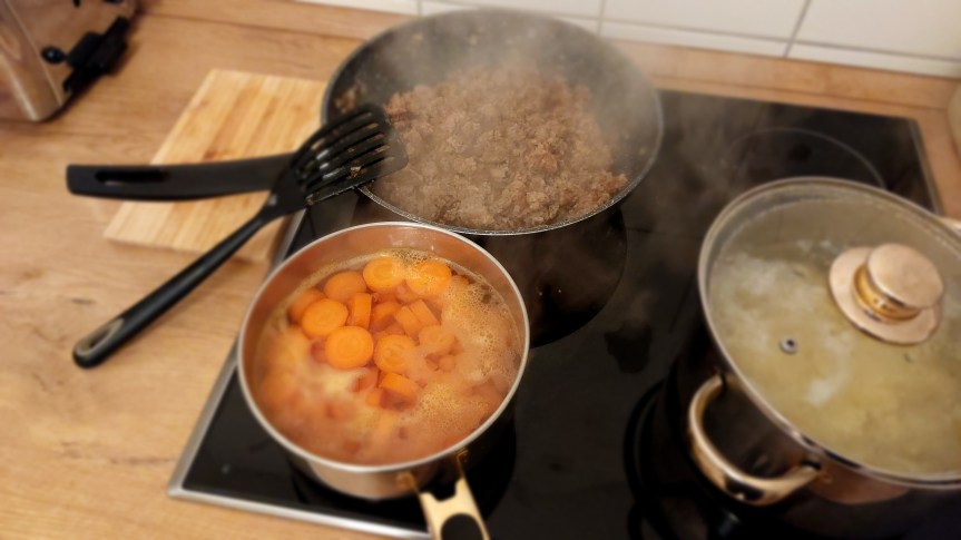 Während die Möhren und die Kartoffeln jetzt also separat in Salzwasser gekocht werden bis sie weich sind (je nach Größe der Stücke etwa 15 Minuten), werden die Zwiebeln geschnitten und mit dem vorher gewürzten Hackfleisch zusammen in einer Pfanne angebraten.