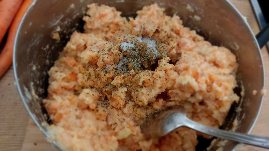 Dann werden die gestampften Möhren und Kartoffeln mit der sauren Sahne zusammengemischt und mit Salz, Pfeffer und Muskat gewürzt. Ich gebe auch gern noch etwas Zimt dazu, was für eine warme Note sorgt.